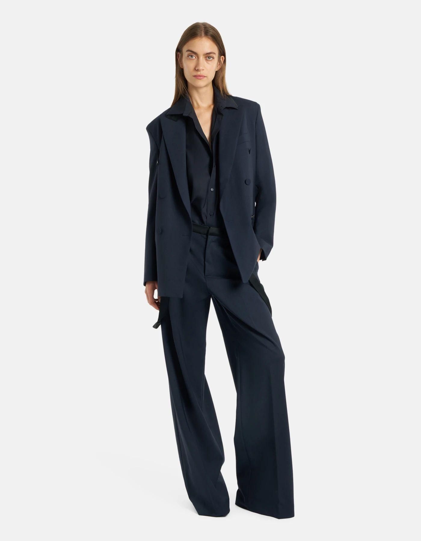 ウール素材を使用したダークネービーのマニッシュな印象のポプリンシャツ。しなやかな光沢があり、しっかりとしたハリが特徴です。