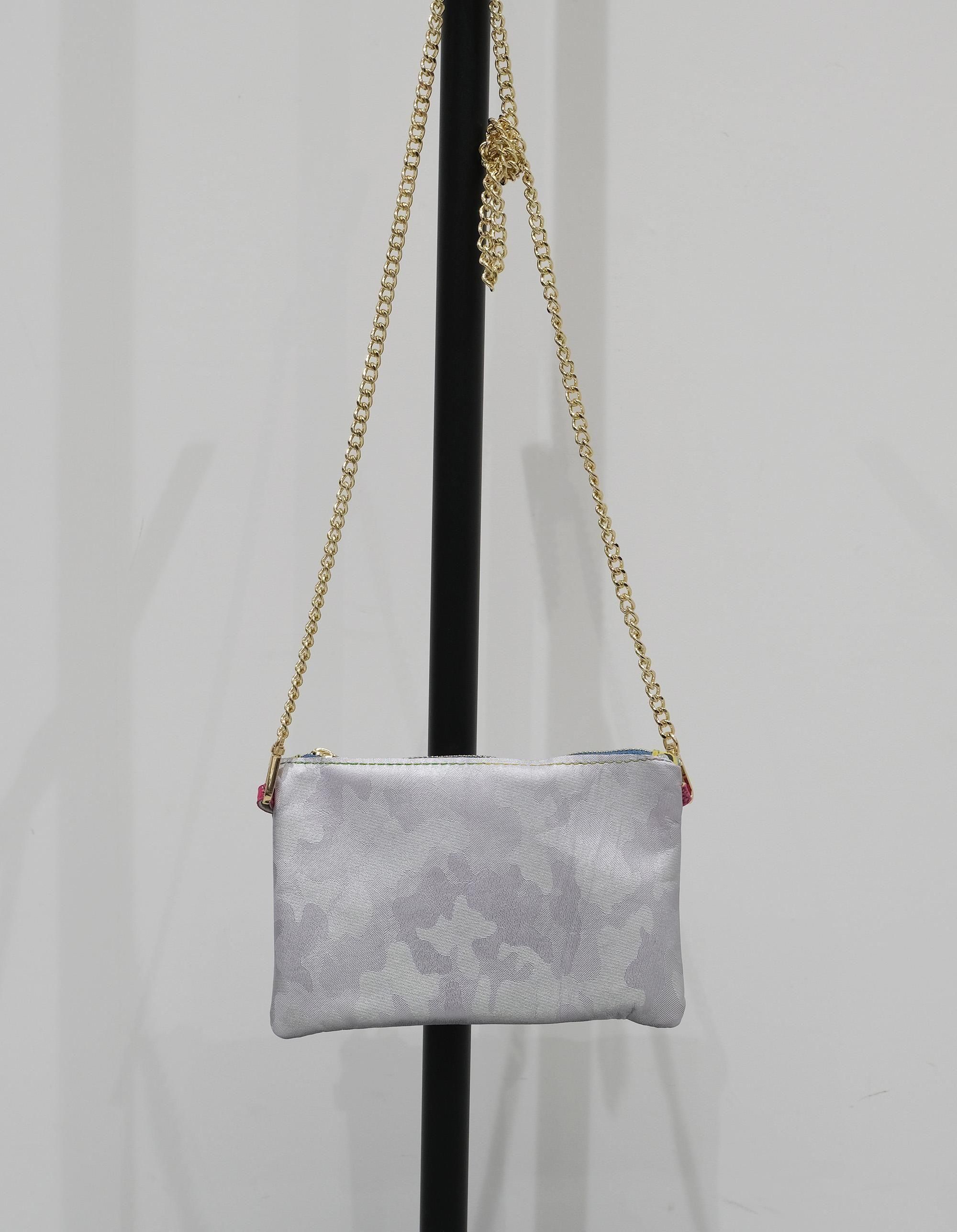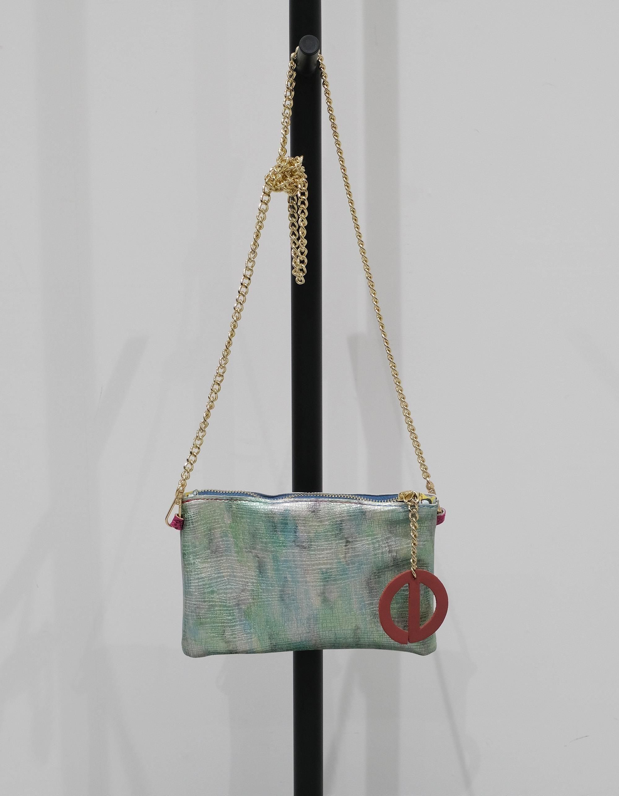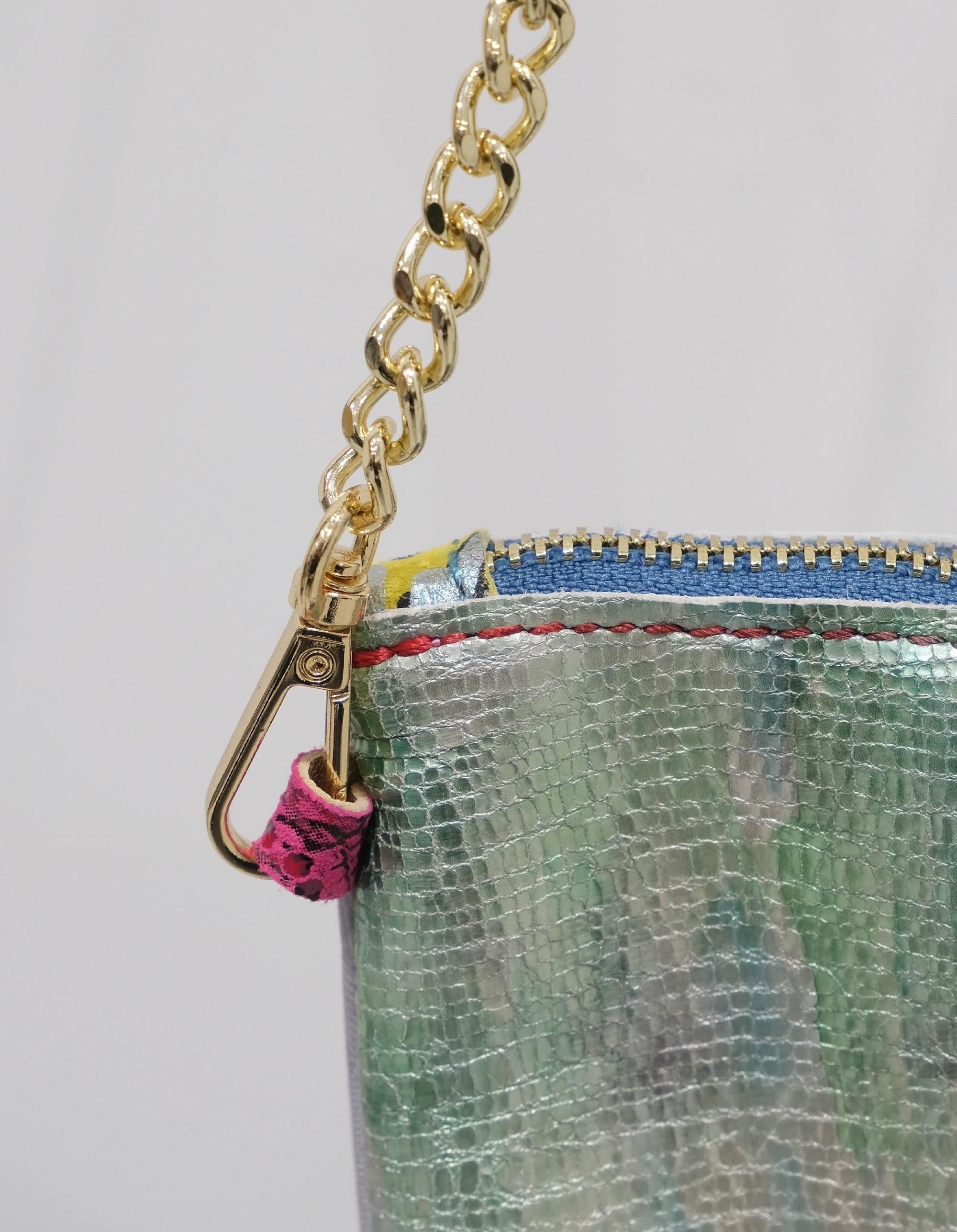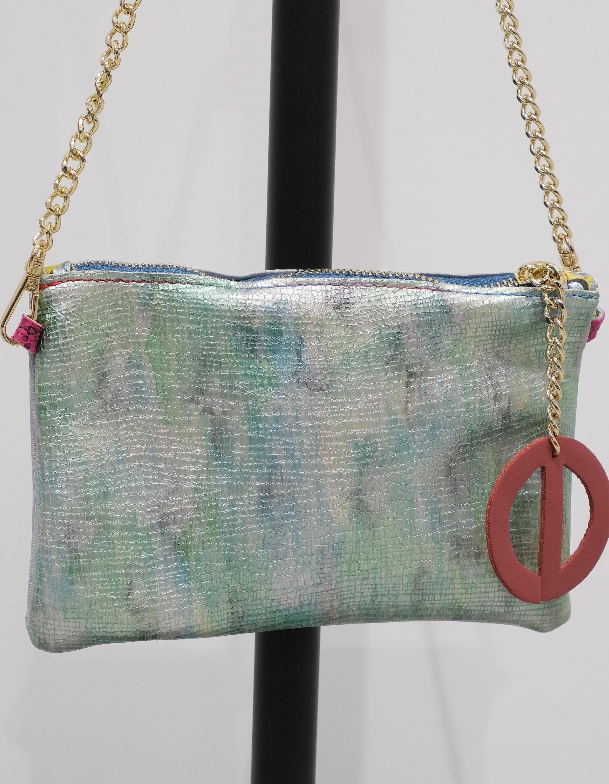 ハイファッションでは使用されないリサイクルレザーを使っており、数種類のレザーや糸を組み合わせて作られたショルダーバッグ!
