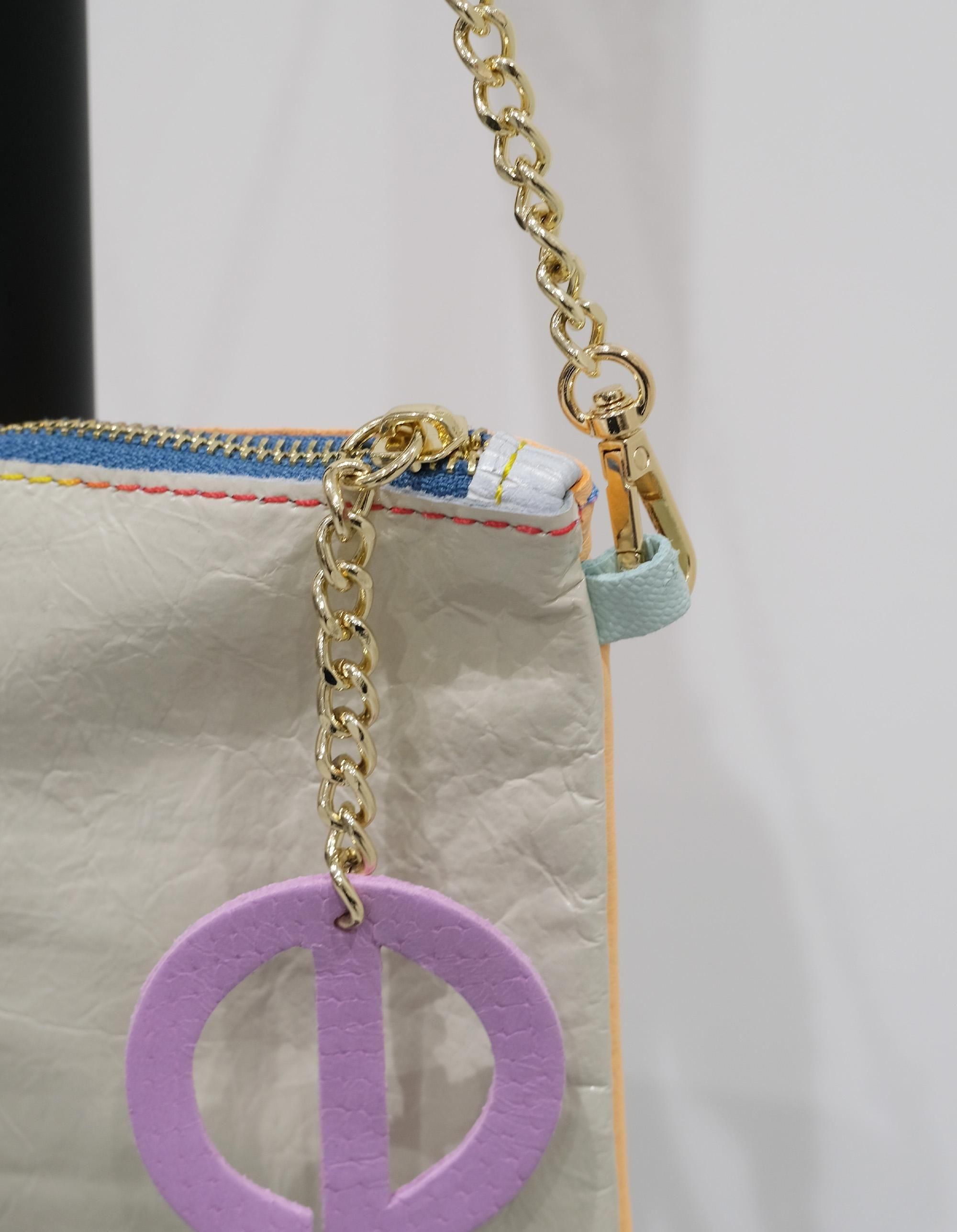 ハイファッションでは使用されないリサイクルレザーを使っており、数種類のレザーや糸を組み合わせて作られたショルダーバッグ!